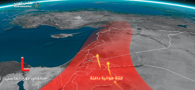 وتشهد درجات الحرارة ارتفاع اضافي وكبير لتصبح أعلى من معدلاتها بنحو 8-10درجات مئوية، ويكون الطقس “خماسيني” جاف وحار نسبياً إلى حار في مُختلف المناطق، وشديد الحرارة في الأغوار والبحر الميت والعقبة بالنسبة لهذا الوقت من العام.