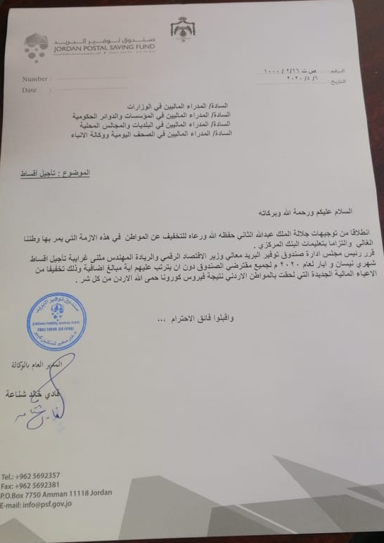 وكالة الناس – انطلاقا من توجيهات جلالة الملك عبدالله الثاني حفظه الله ورعاه، للتخفيف عن المواطن في هذه الأزمة التي يمر بها وطننا الغالي والتزاما بتعليمات البنك المركزي، قرر رئيس مجلس إدارة صندوق توفير البريد وزير الاقتصاد الرقمي والريادة المهندس مثنى غرايبة تأجيل أقساط شهري نيسان وايار للعام 2020م، لجميع مقترضي الصندوق دون ان يترتب عليهم اية مبالغ اضافية، وذلك للتخفيف من الاعباء المالية الجديدة التي لحقت بالمواطن الاردني نتيجة فيروس كورونا.