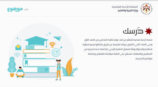 وقالت الوزارة إن عملية التقييم ستجري عبر منصة درسك (www.darsak.gov.jo)، وذلك ضمن المنظومة التي أطلقتها للتعليم عن بعد، منذ تعليق دوام المدارس في ظل الظروف الاستثنائية التي تمر بها المملكة في إطار الإجراءات الاحترازية والوقائية للتعامل مع فيروس كورونا المستجد.