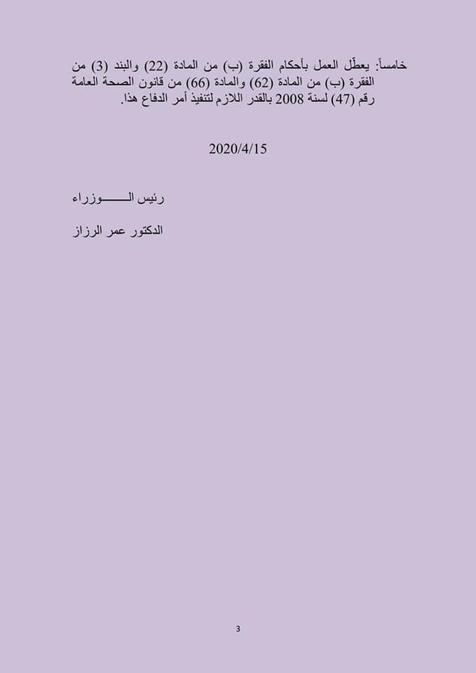 وكالة الناس – أعلن رئيس الوزراء الدكتور عمر الرزاز بعد قليل أمري الدفاع رقم 7 ورقم 8 الصادرين بموجب قانون الدفاع رقم 13 لسنة 1992، ويختص امر الدفاع رقم 7 بتنظيم التعليم المدرسي والجامعي والتدريب المهني عن بعد وآليات تقييم الطلبة، فيما يختص امر الدفاع رقم 8 باتخاذ اجراءات لحماية الصحة العامة وللحد من انتشار عدوى فيروس كورونا.