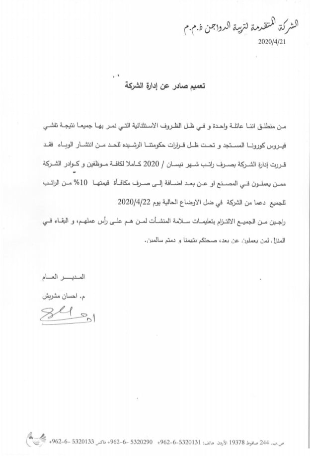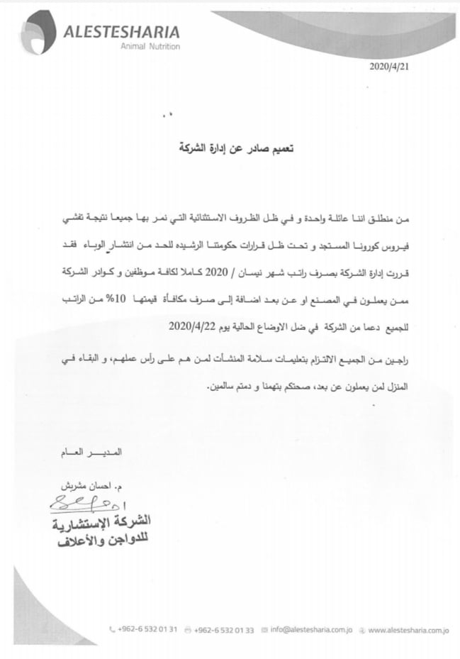 وكالة الناس – أصدر مدير عام الشركة الاستشارية للدواجن والاعلاف المهندس احسان مشربش تعميما أعلن فيه أن الشركة قررت صرف راتب شهر نيسان الحالي لجميع العاملين في المصنع أو عن بعد، وأضاف في التعميم أنه تقرر صرف ما نسبته ١٠ % من قيمة الراتب للجميع وذلك دعما من الشركة في ظل الظروف الحالية.