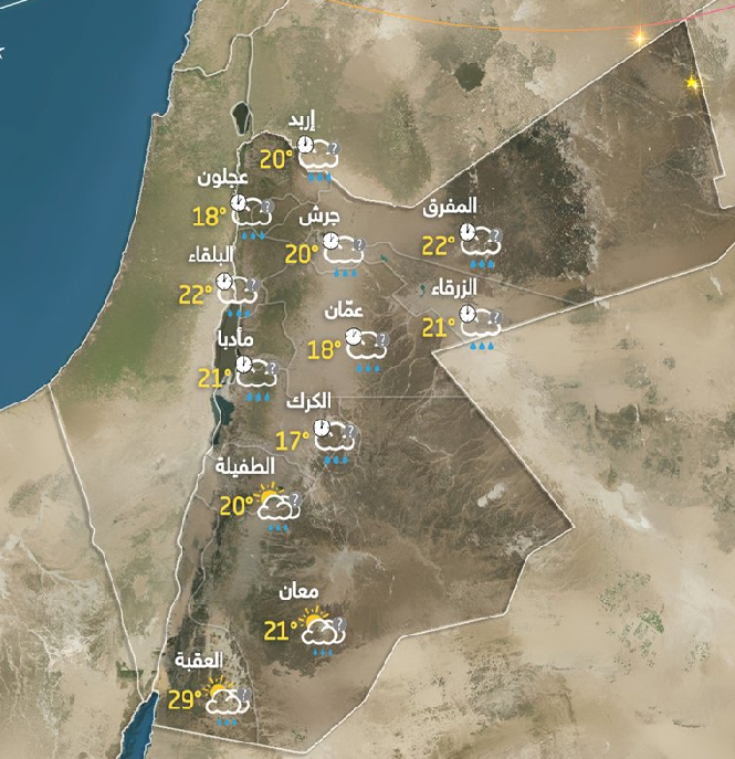 تبقى الأجواء ليلا باردة نسبياً، مع ظهور الغيوم على ارتفاعات مختلفة، وتتهيأ الفرصة لسقوط زخات محلية متفرقة من المطر خاصة في جنوب الأردن بما فيها مدينة العقبة، الرياح غربية معتدلة الى نشطة السرعة احياناً مثيرة للغبار في مناطق البادية.