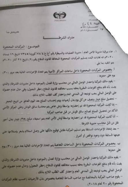 هذا ما يترتب على اصحاب السيارات المحجوزة لاستلامها (وثيقة) Last updated أبريل 27, 2020 Share وكالة الناس – بينت وثيقة للامن العام، تعليمات تسليم المركبات المخالفة لاصحابها والمحجوزة في عدة مناطق بالمملكة، وتاليا التفاصيل: