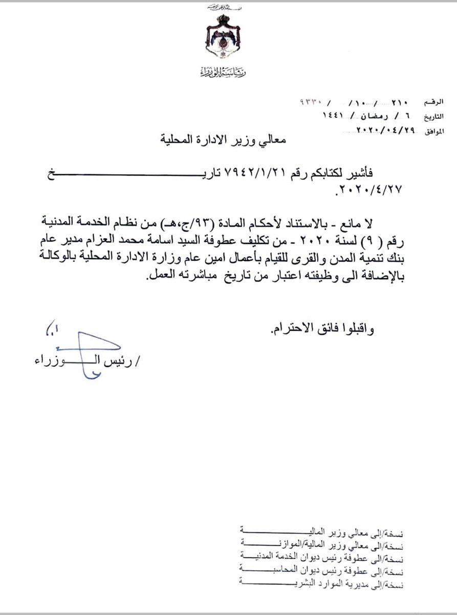 العزام أميناً عاماً لوزارة الإدارة المحلية بالوكالة (وثيقة)