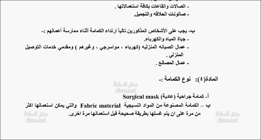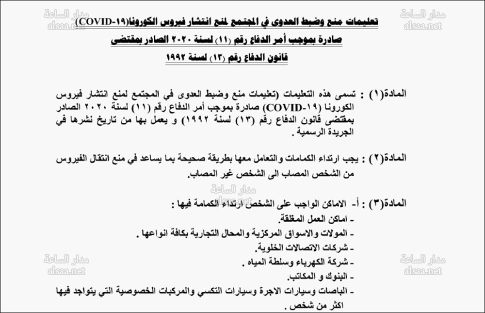 وطلبت التعليمات ارتداء الكمامات والتعامل معها بطريقة صحيحة بما يساعد في منع انتقال الفيروس من الشخص المصاب الى الشخص غير المصاب، وفيما قالت المادة (3) من التعليمات : أ- الأماكن الواجب على الشخص ارتداء الكمامة فيها: