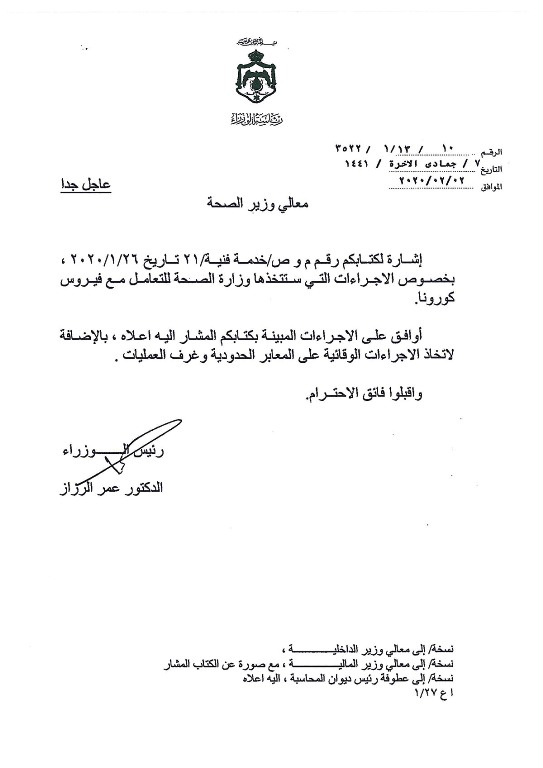 وكالة الناس – أكد كتاب رسمي وجهه رئيس الوزراء الدكتور عمر الرزاز إلى وزير الصحة بتاريخ 2 شباط 2020 موافقته على الإجراءات، التي اتخذتها وزارة الصحة للتعامل مع فيروس كورونا بما فيها إعطاء وزير الصحة صلاحية منح مكافأة مالية شهرية مستمرة لحين انتهاء الوباء، للكوادر الصحية التي تتعامل مع الحالات المرضية.