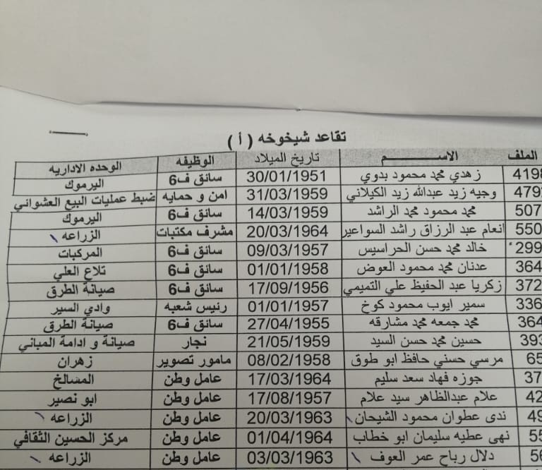 بالأسماء .. احالات إلى التقاعد في أمانة عمان Last updated يونيو 1, 2020 Share وكالة الناس – قرر امين عمان الدكتور يوسف الشواربة اليوم الاثنين ، احالة عدد من موظفي الامانة الى التقاعد شملت مديري ادارات، ورؤساء اقسام.وتاليا الاسماء: