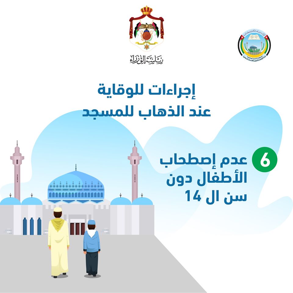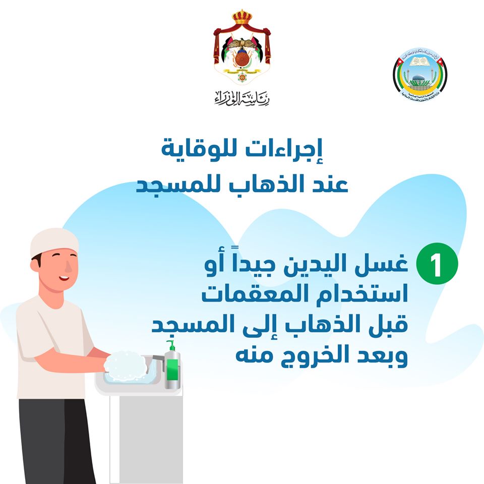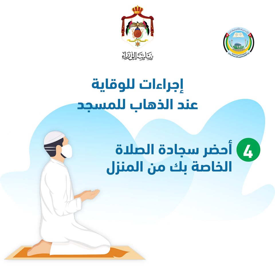 ودعا إلى ضرورة المحافظة على التباعد الجسدي بين المصلين والالتزام بعدم المصافحة والتقبيل، إلى جانب إلزام كل مصل أوعامل بالمسجد بإحضار سجادة صلاة خاصة فيه، وأشار إلى أهمية فتح المسجد قبل الأذان بوقت كاف وإغلاقه بعد الانتهاء من الصلاة، وعدم تشغيل المكيفات والمراوح، وفتح النوافذ والأبواب من بداية فتح المسجد لغاية مغادرة المصلين وإغلاقه، وشدد الخلايلة على عدم الإطالة في صلاة الجماعة والالتزام بالتخفيف على المصلين، وإبقاء المرافق التابعة للمسجد مغلقة كالمكتبات، والمرافق الصحية، ودور القرآن الكريم.