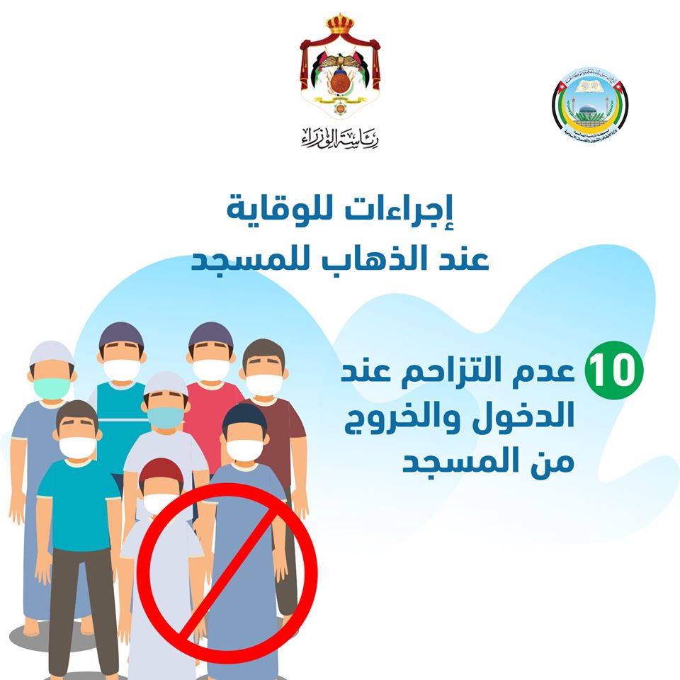 وأشار في تعميمه إلى أنه يجب وضع علامات داخل المسجد تحدد مكان وقوف المصلين لضمان التباعد مع الحرص على ترك مسافات مناسبة بين المصلين وتباعد الصفوف وتطبيق ذلك في جميع الصلوات، بما فيها صلاة الجنازة، وحول مصليات النساء لفت الخلايلة إلى أهمية تجهيزها للصلاة وإعدادها لصلاة الرجال المصلين، وذلك تجنباً للزحام، فضلا عن إرجاء إعطاء الدروس والمواعظ حاليا، والاقتصار على الصلاة في المساجد للرجال فقط.