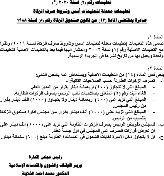 وكالة الناس – نشرت الحكومة في الجريدة الرسمية تعديلات على تعليمات أسس وشروط صرف الزكاة ، وتعليمات لجان الزكاة، وشملت التعديلات، ان لا تزيد قيمة الزكوات الطائرة عن 400 دينار ، وان المبالغ التي تتجاوز ذلك بحاجة الى قرار من رئيس المجلس، وفيما يلي نص التعليمات: