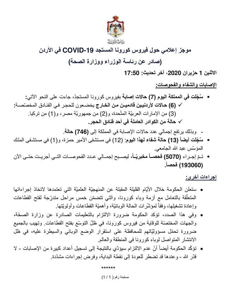 وكالة الناس – موجز إعلامي حول فيروس كورونا المستجد COVID-19 في الأردن، (صادر عن رئاسة الوزراء ووزارة الصحة)، الاثنين 1 حزيران 2020.