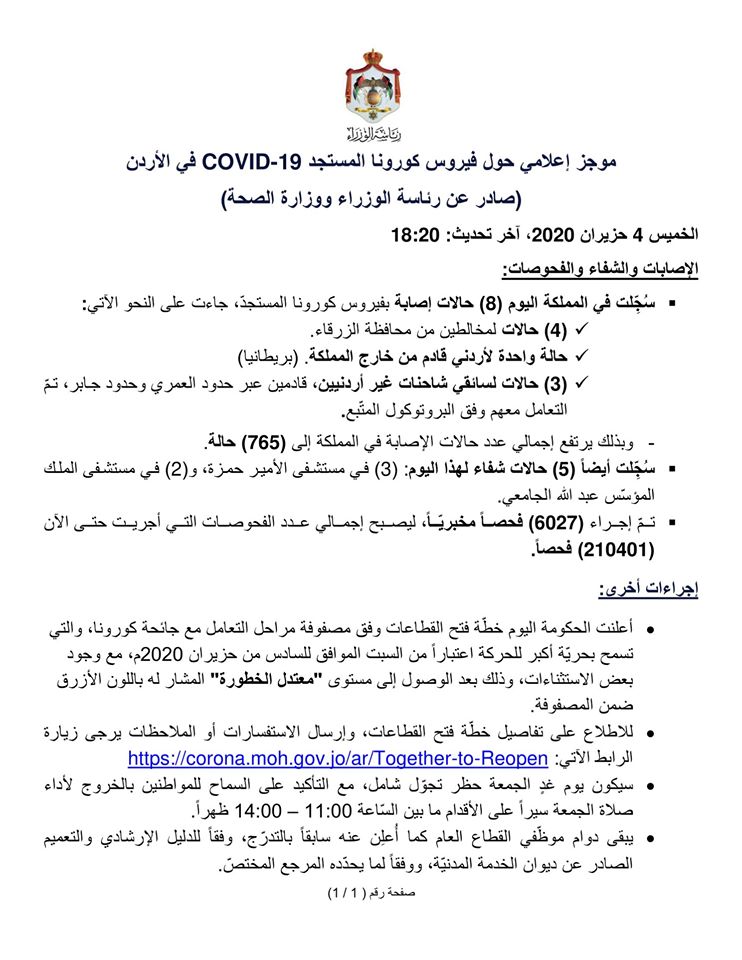 وكالة الناس – موجز إعلامي حول فيروس كورونا المستجد COVID-19 في الأردن (صادر عن رئاسة الوزراء ووزارة الصحة) الخميس 4 حزيران 2020.
