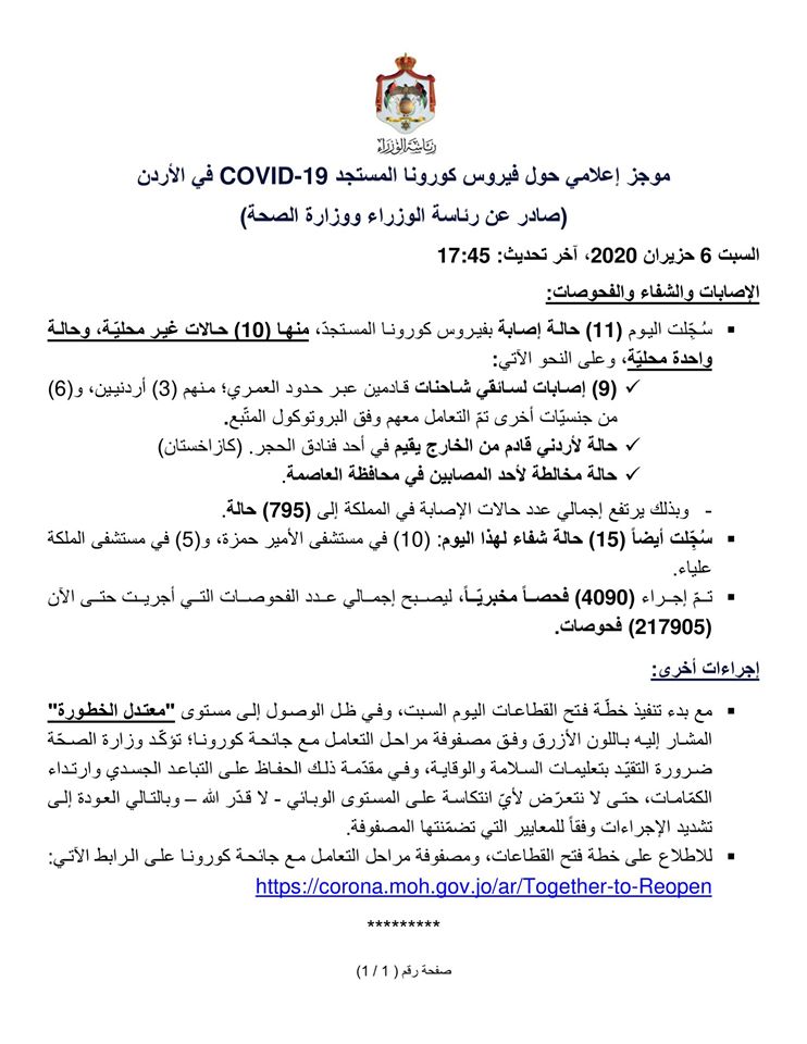 وكالة الناس – موجز إعلامي حول فيروس كورونا المستجد COVID-19 في الأردن (صادر عن رئاسة الوزراء ووزارة الصحة) السبت 6 حزيران 2020.