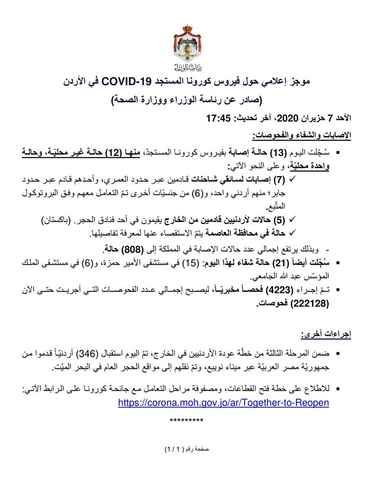 وكالة الناس – موجز إعلامي حول فيروس كورونا المستجد COVID-19 في الأردن (صادر عن رئاسة الوزراء ووزارة الصحة) الأحد 7 حزيران 2020.