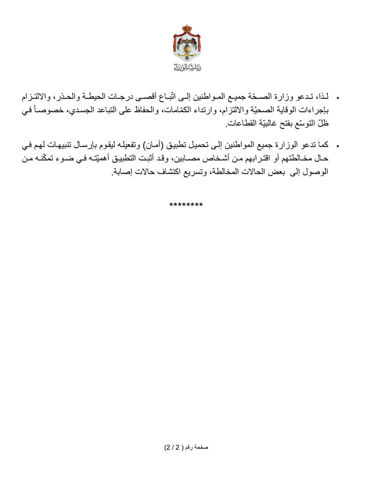 – كما تدعو الوزارة جميع المواطنين إلى تحميل تطبيق (أمان) وتفعيله ليقوم بإرسال تنبيهات لهم في حال مخالطتهم أو اقترابهم من أشخاص مصابين، وقد أثبت التطبيق أهميّته في ضوء تمكّنه من الوصول إلى بعض الحالات المخالطة، وتسريع اكتشاف حالات إصابة.