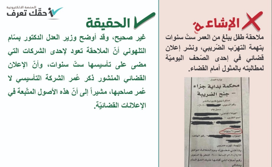 وكالة الناس – نفت الحكومة عبر منصة حقك تعرف شائعة تداولها أردنيون عبر مواقع التواصل تزعم بملاحقة طفل يبلغ من العمر ست سنوات بتهمة التهرب الضريبي.