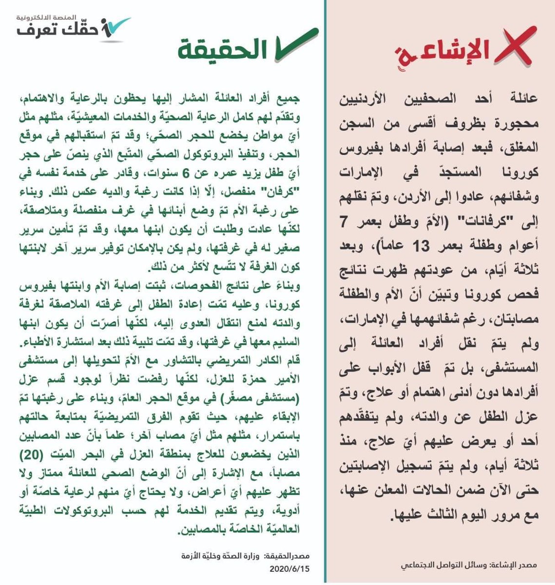 وكالة الناس – نفت الحكومة عير منصة “حقك تعرف” مساء الاثنين، ما يتم تناقله عبر مواقع التواصل الاجتماعي حول إخضاع عائلة أحد الصحفيين للحجر الصحّي في ظروف قاسية، مؤكدة انها شائعة “غير صحيحة”.