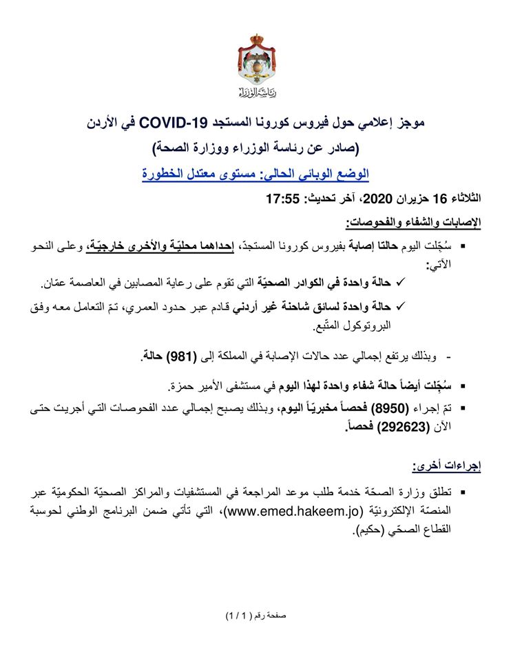وكالة الناس – موجز إعلامي حول فيروس كورونا المستجد COVID-19 في الأردن (صادر عن رئاسة الوزراء ووزارة الصحة) الوضع الوبائي الحالي: مستوى معتدل الخطورة، الثلاثاء 16 حزيران 2020.