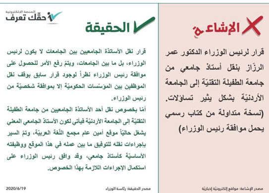وأضافت رئاسة الوزراء: ‘أما بخصوص نقل أحد الأساتذة الجامعيين من جامعة الطفيلة التقنية إلى الجامعة الأردنية؛ فيأتي لكون الأستاذ الجامعي المعني يشغل حالياً موقع أمين عام مجمع اللغة العربية، وتم السير بإجراءات نقله للتوفيق ما بين عمله في هذا الموقع ووظيفته الأساسية كأستاذ جامعي، وقد وافق رئيس الوزراء على استكمال الإجراءات اللازمة بهذا الخصوص’.