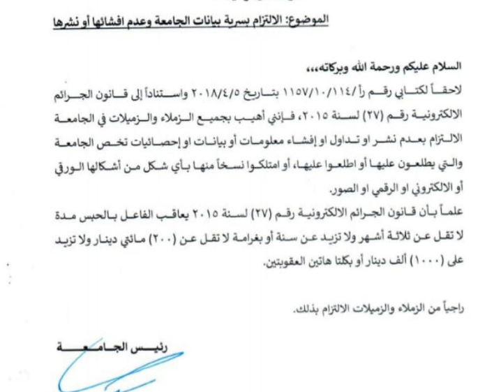 وذكر التعميم ان مثل هذا التداول من شانه لجوء الجامعة لقانون الجرائم الالكترونية الذي يعاقب بالحبس مدة لاتقل عن ثلاثة اشهر ولا تزيد عن سنة او غرامة من 200 دينار الى 1000دينار او بكلتا العقوبتين .