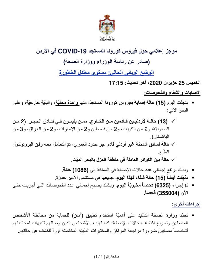 وكالة الناس – موجز إعلامي حول فيروس كورونا المستجد COVID-19 في الأردن (صادر عن رئاسة الوزراء ووزارة الصحة) الوضع الوبائي الحالي: مستوى معتدل الخطورة الخميس 25 حزيران 2020.