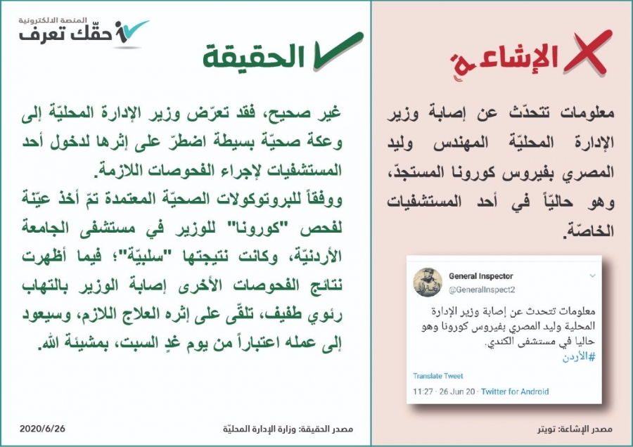 وكالة الناس – أكدت الحكومة عبر منصة ” حقك تعرف ” عدم صحة المعلومات التي تتحدث عن إصابة وزير الإدارة المحلية المهندس وليد المصري بفيروس كورونا المستجد وهو حالياً في احد المستشفيات الخاصة.