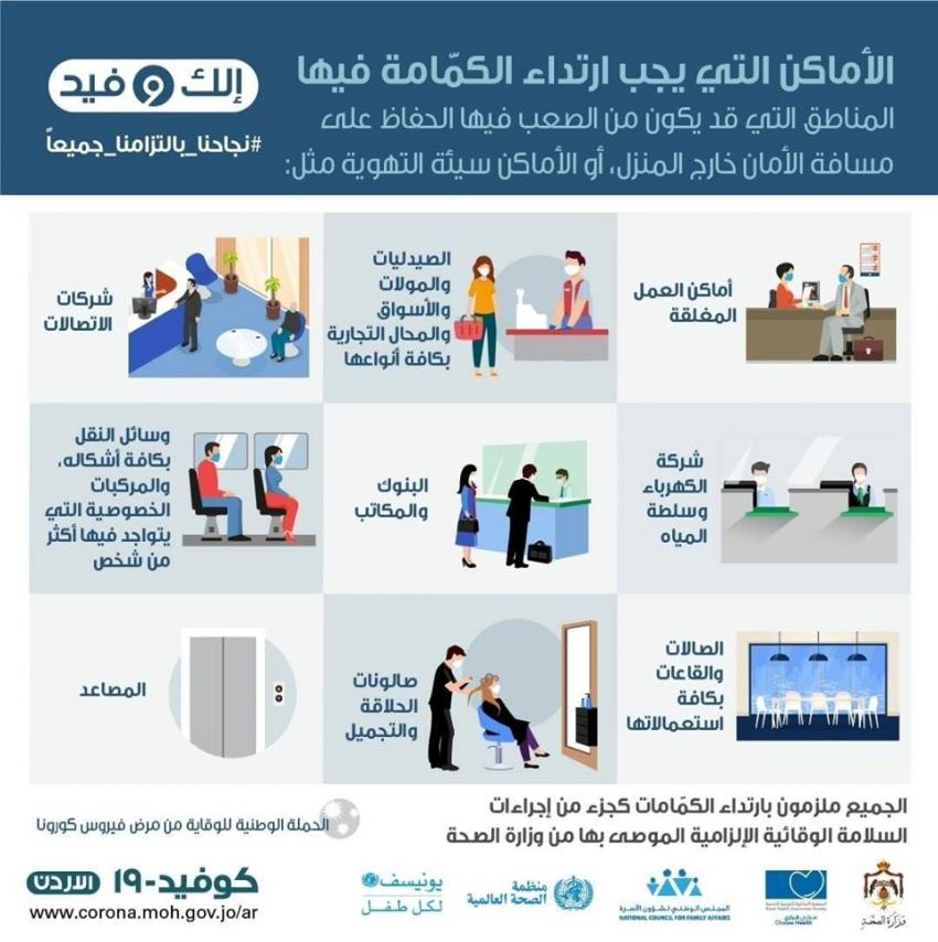| وكالة الناس – دعت وزارة الصحة الى جعل الكمامة جزء من الحياة اليومية للمواطنين، مؤكدة أنها تقلل من فرصة انتقال عدوى فيروس كورونا المستجد. وقالت إن التهوية قد تكون سيئة في بعض الأماكن العامة وقد يصعب تحقيق التباعد الجسدي في بعضها، مبينة أن ارتداء الكمامة سيساعد على الحماية في تلك الأماكن. من جهتها مديرية الامن العام أكدت أن الجميع ملزمون بارتداء الكمّامة كجزء من إجراءات السلامة الوقائية الإلزامية الموصى بها من وزارة الصحة. |