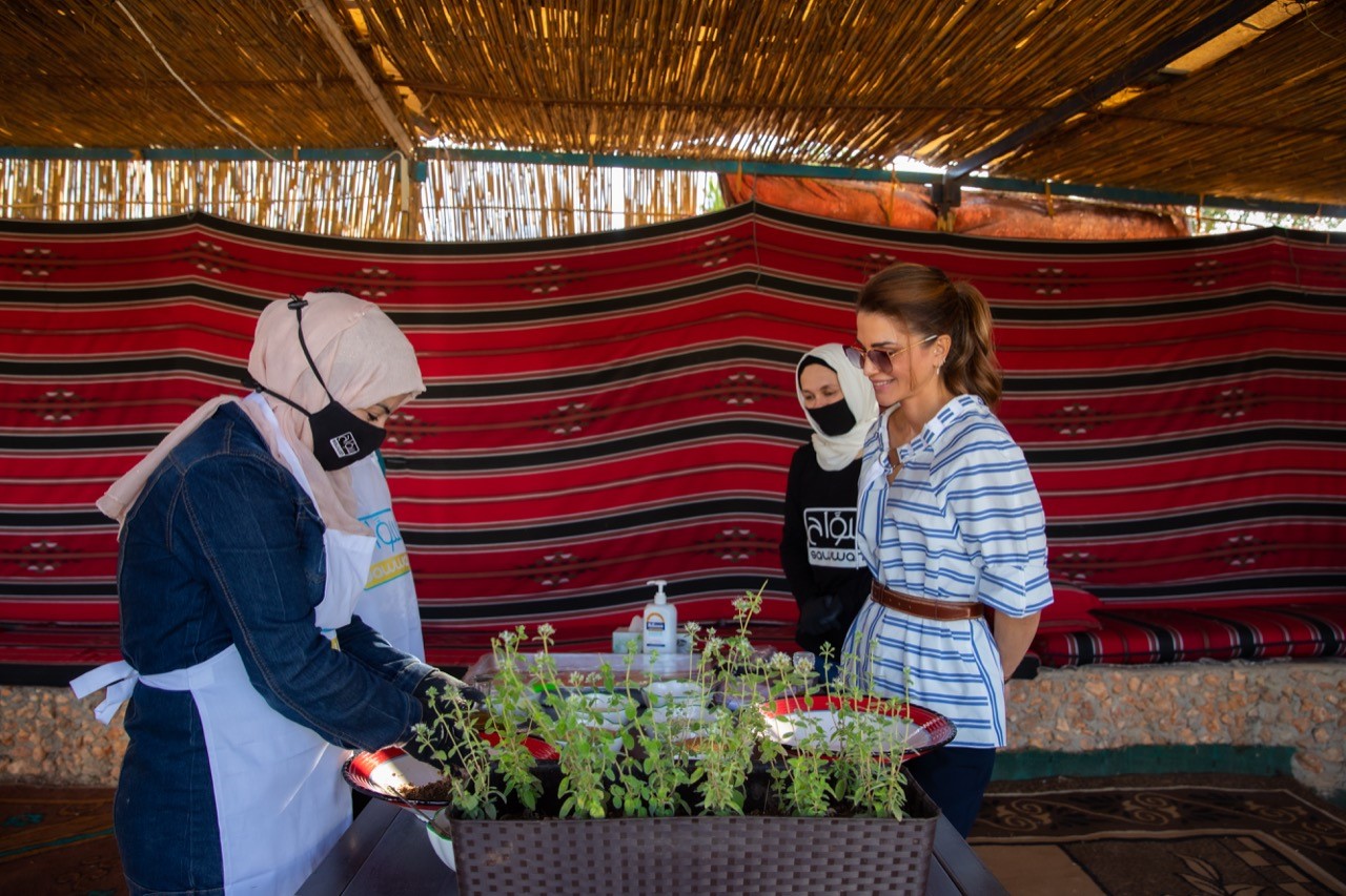 وفي بيت ريف الينابيع، اطلعت جلالتها على الحديقة وشاركت في عمل الزعتر، واستمعت الى شرح من المدير التنفيذي لمنصة “سواح” سحر برقاوي حول الدور الذي تقوم به المنصة بهدف تسليط الضوء على السياحة المستدامة، حيث توفر المنصة والتطبيق الالكتروني المجال لحجز التجارب السياحية وربط المسافرين بتجارب تراثية متاحة من مزودي خدمات تجارب سياحية مختلفة في الأردن، ويوفر لأهل المجتمعات المحلية فرصة الحصول على مصدر جديد للدخل.