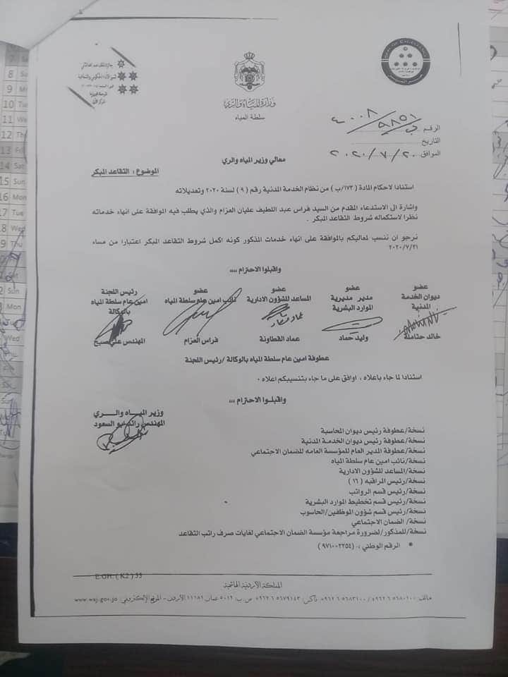 وجاء في التفاصيل بانه افق وزير المياه على طلب احالة أحد موظفي الوزارة على التقاعد المبكر كونه أكمل شروط التقاعد المبكر اعتبارا من تاريخ 21/7/2020، حيث رفع الكتاب بتاريخ 20/7/2020 موشحا بتوقيع الجهات ذات العلاقة ( ديوان الخدمة المدنية، والموارد البشرية، وباقي أعضاء اللجنة)، وتم ارسال الكتاب إلى الجهات الحكومية الاخرى ( ديوان المحاسبة، الضمان الاجتماعي لغايات صرف راتب التقاعد..الخ)