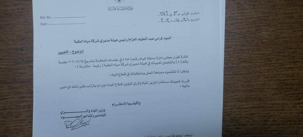 كما صدور كتاب في اليوم ذاته بتعيين الموظف المتقاعد رئيسا متفرغا لهيئة مديري شركة مياه العقبة استنادا لقرار مجلس إدارة سلطة المياه بتاريخ 15/7/2020 إضافة إلى تعيينه مستشارا للوزير لشؤون قطاع المياه.