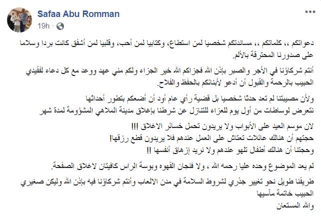 وكتبت أبو رمان “دعواتكم ،، كلماتكم ،، مساندتكم شخصيا لمن استطاع، وكتابيا لمن أحب، وقلبيا لمن أشفق كانت بردا وسلاما على صدورنا المحترقة بالألم”.