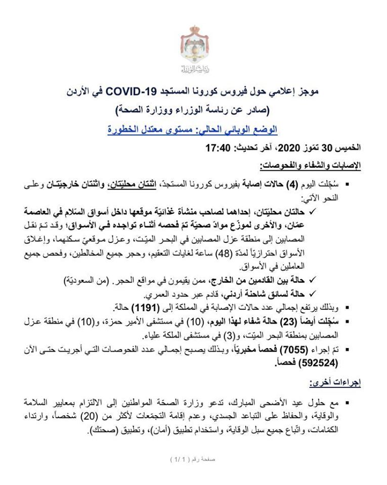 – حالتان محليّتان، إحداهما لصاحب منشأة غذائيّة موقعها داخل أسواق السّلام في العاصمة عمّان، والأخرى لموزّع موادّ صحيّة تمّ فحصه أثناء تواجده في الأسواق؛ وقد تمّ نقل المصابين إلى منطقة عزل المصابين في البحر الميّت، وعزل موقعيّ سكنهما، وإغلاق الأسواق احترازيّاً لمدّة (48) ساعة لغايات التعقيم، وحجر جميع المخالطين، وفحص جميع العاملين في الأسواق.