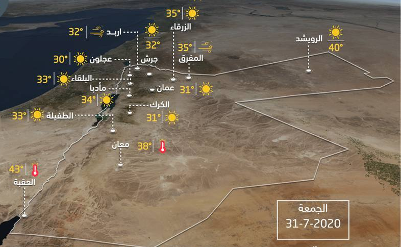 و يتحول الطقس ليُصبح لطيفاً في أغلبية المناطق، و مُعتدلاً في مناطق الأغوار و البحرالميت و العقبة/، تظهر بعض السحب المُنخفضة فوق المُرتفعات، تكون الرياح شمالية غربية مُعتدلة إلى نشطة السرعة، مُرفقة بهبات قوية فوق جبال الشراه في جنوب المملكة.