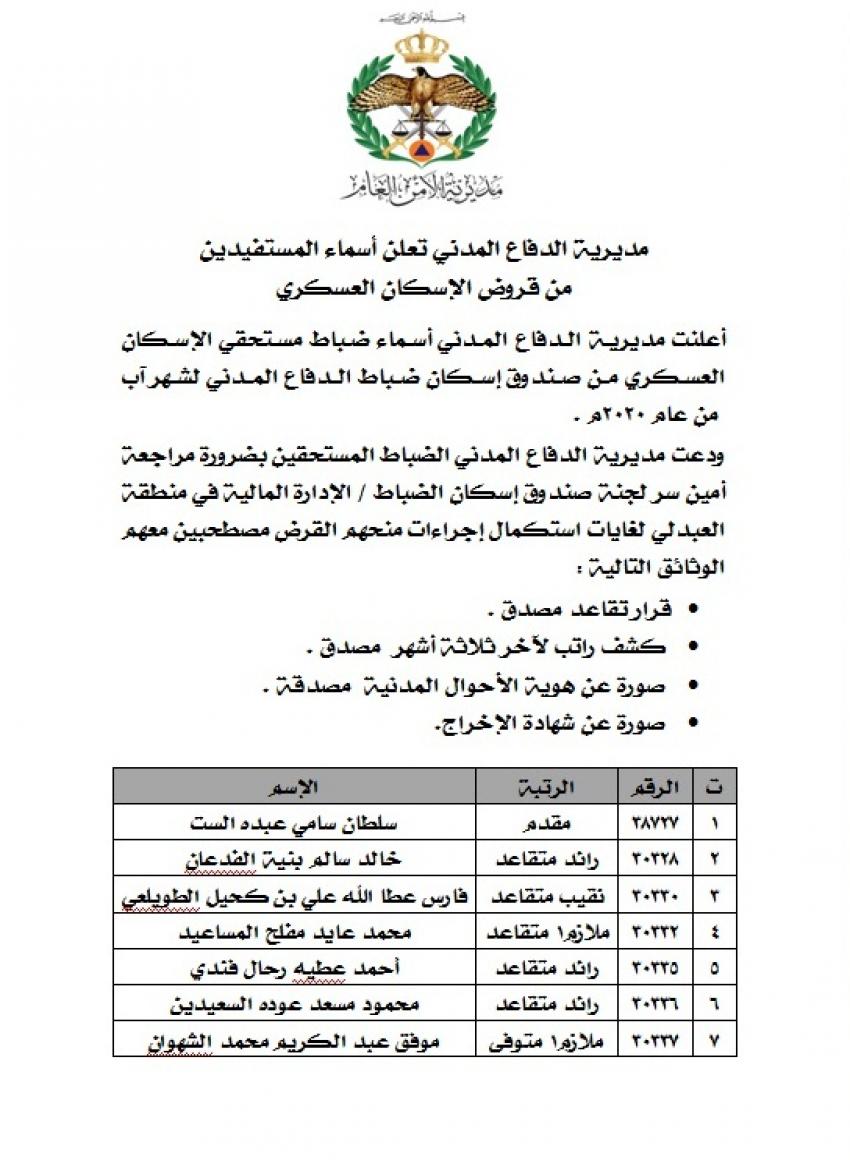 وكالة الناس – أعلنت مديرية الدفاع المدني اليوم الثلاثاء أسماء المستفيدين من قروض الإسكان العسكري.