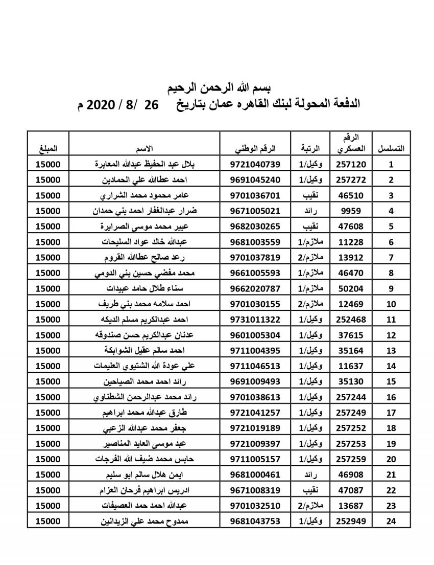 ويبلغ عدد المستحقين للقروض الإسكانية لشهر اب 2020 نحو (507)، وتم تحويل المستحقات الى بنك القاهرة عمان وفروعه داخل المملكة.