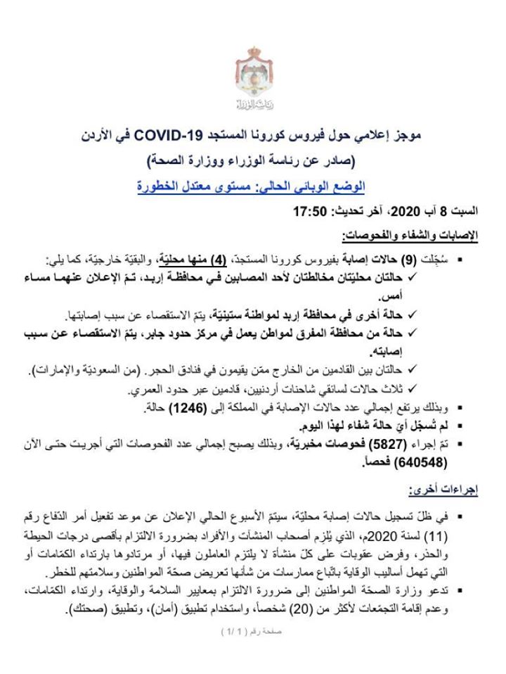 وكالة الناس – موجز إعلامي حول فيروس كورونا المستجد COVID-19 في الأردن (صادر عن رئاسة الوزراء ووزارة الصحة)