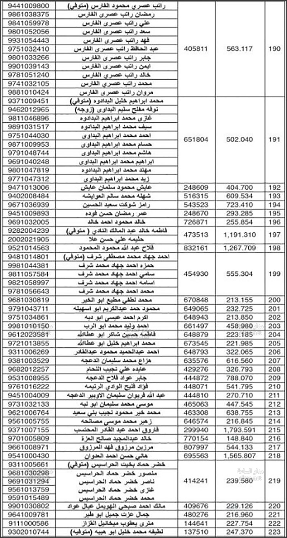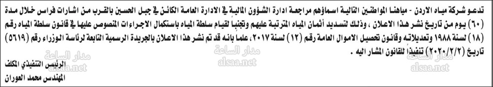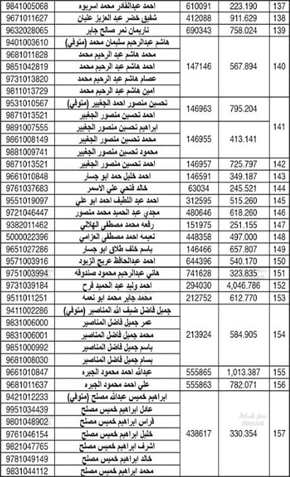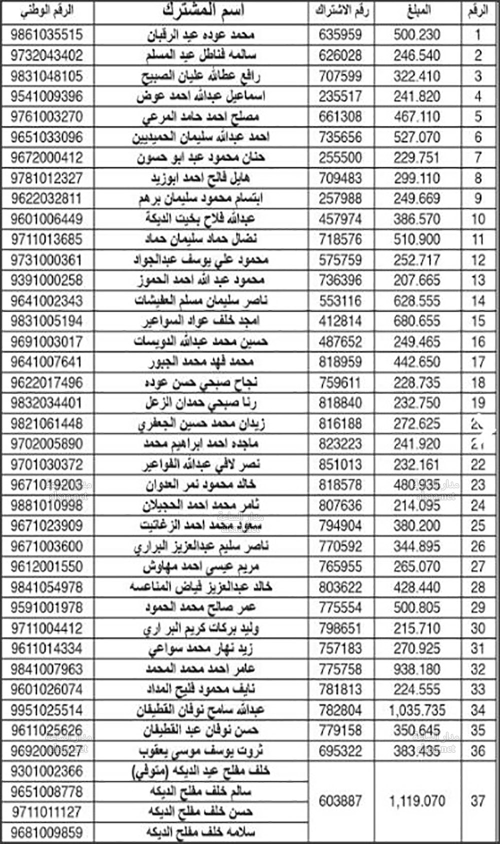 وكالة الناس – دعت شركة مياهنا اليوم الخميس التالية اسماؤهم إلى مراجعة ادارة الشؤون المالية في الشركة لتسديد أثمان المياه المترتبة عليهم وتجنبا لقيام سلطة المياه باستكمال الاجراءات المنصوص عليها في قانون السلطة.