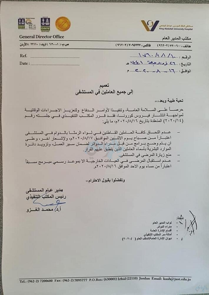 وكالة الناس – قرر مدير عام مستشفى الملك المؤسس عبد الله الجامعي الدكتور محمد الغزو عدم إلتحاق كافة العاملين القاطنين في لواء الرمثا بالدوام في المستشفى إعتبارا من صباح الإثنين 17/8/2020.