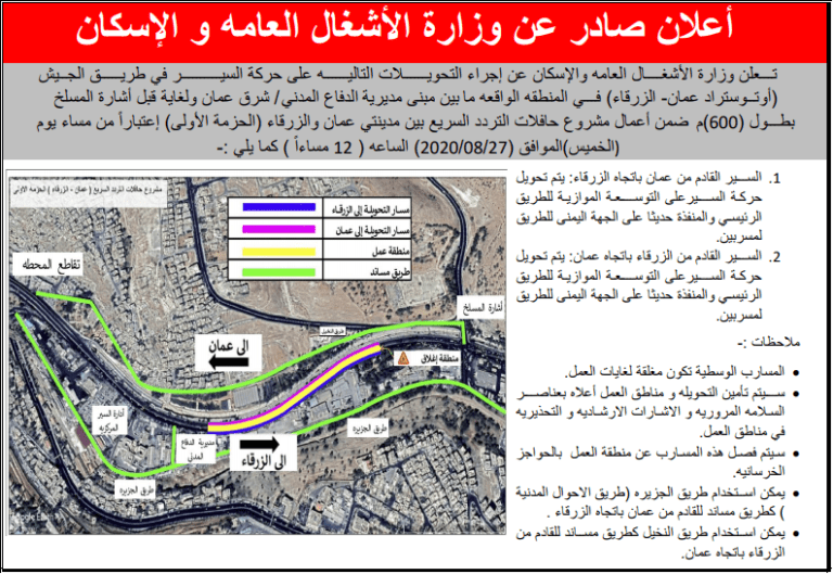 وقررت الوزارة بحسب بيان صحفي، تحويل السـير القادم من عمان باتجاه الزرقاء على التوسعـة الموازية للطريق الرئيسـي والمنفذة حديثا على الجهة اليمنى للطريق لمسربين. ويتوجب على السـير القادم من الزرقاء الى عمان الاتجاه على التوسعـة الموازيـة للطريق الرئيسـي والمنفذة حديثا على الجهة اليمنى للطريق لمسربين.