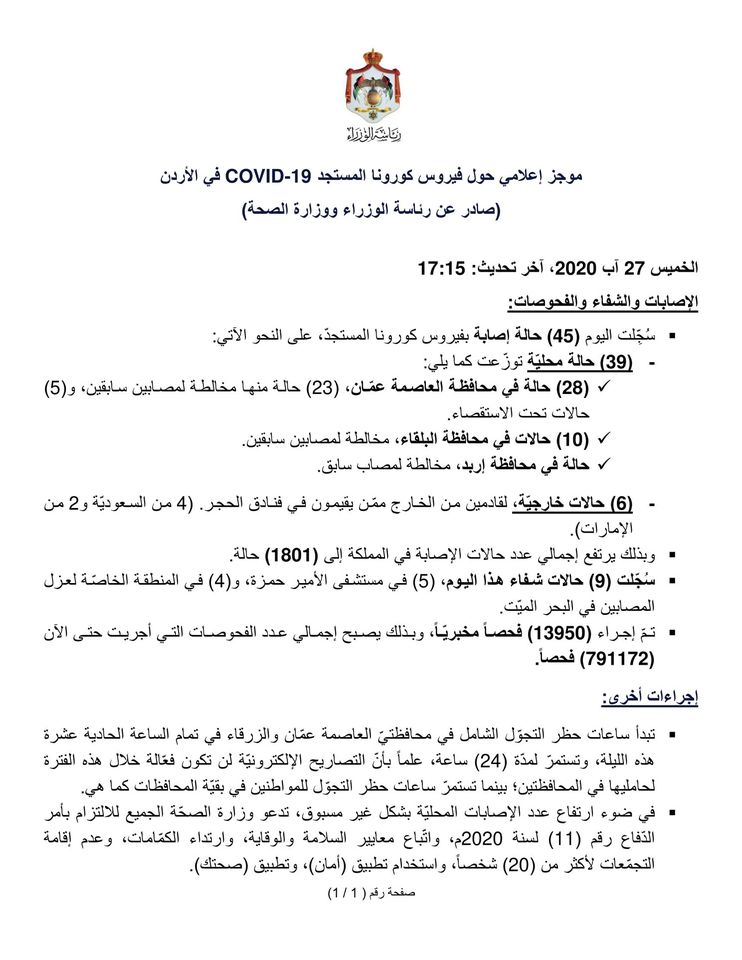 وكالة الناس – موجز إعلامي حول فيروس كورونا المستجد COVID-19 في الأردن (صادر عن رئاسة الوزراء ووزارة الصحة) الخميس 27 آب 2020.