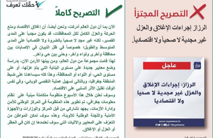 وكالة الناس – اوضحت الحكومة عبر المنصة الإلكترونية حقك تعرف حول تصريح رئيس الوزراء الدكتور عمر الرزاز المجتزأ حول إجراءات الإغلاق والعزل، وأضافت المنصة، عبر حسابها على منصة تويتر، أن التصريح مجتزأ من رسالة الرزاز الأسبوعية.