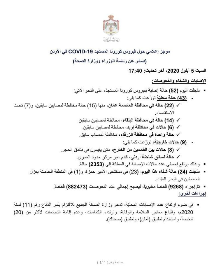 – سُجّلت (24) حالة شفاء هذا اليوم، (23) في مستشفى الأمير حمزة، و(1) في المنطقة الخاصّة بعزل المصابين في البحر الميّت.