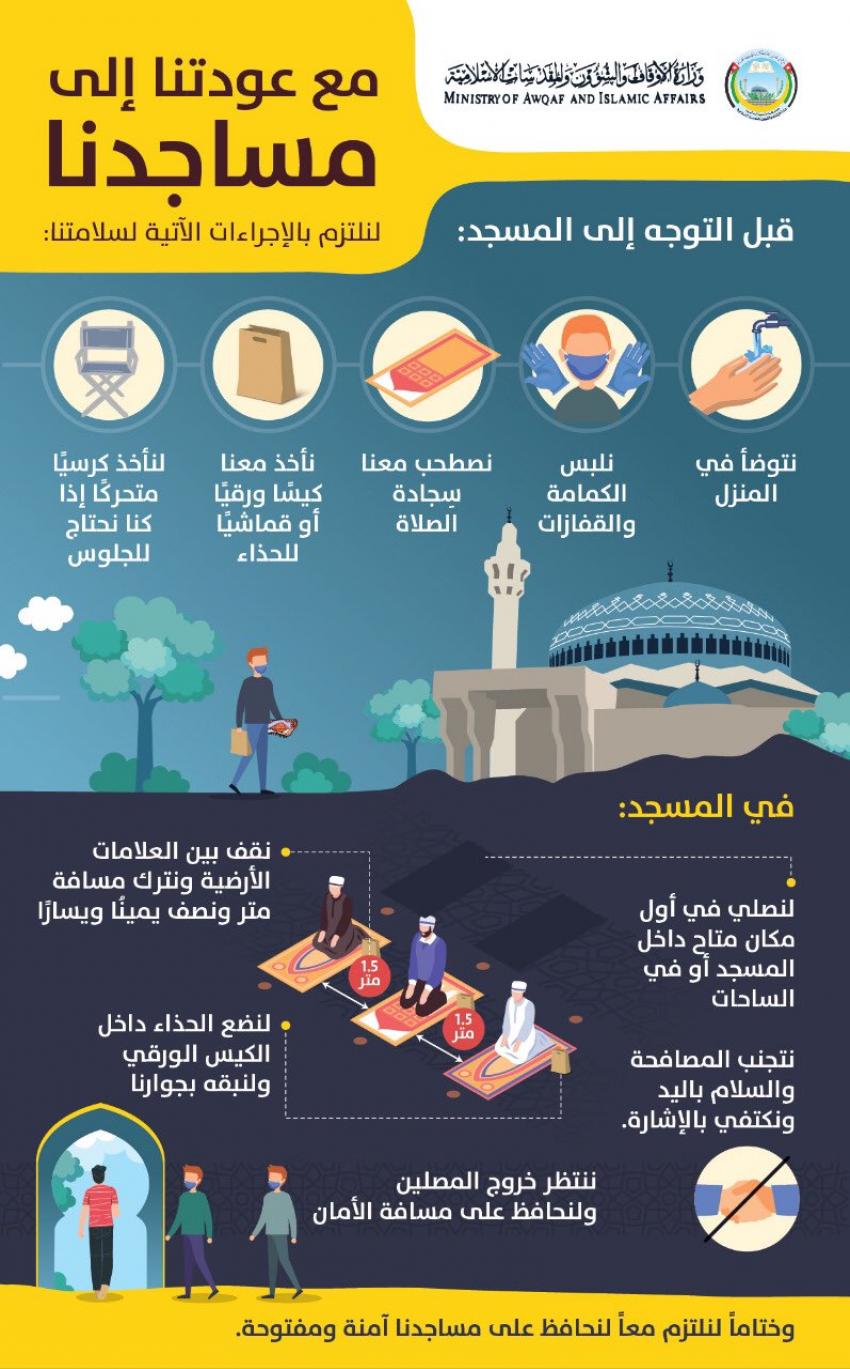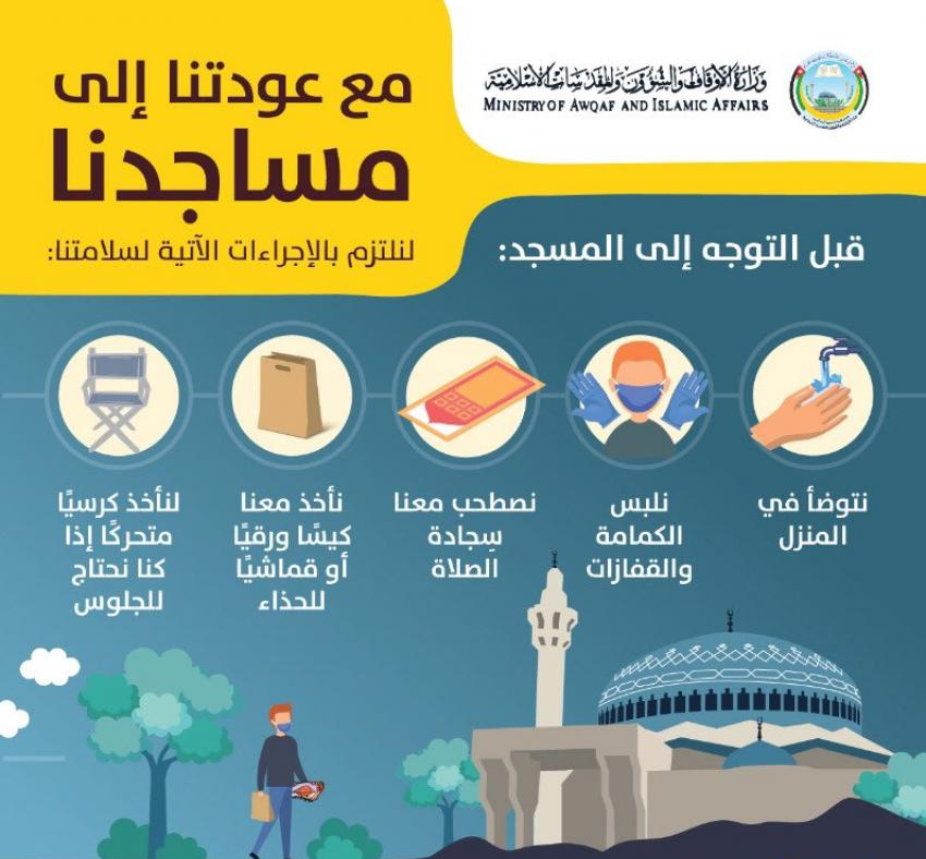 ودعت الوزارة الى الوضوء في المنزلوارتداء الكمامة والقفازات قبل ارتياد المساجد، اضافة الى اخذ سجادة صلاة خاصة وكيس ورقي او قماشي للحذاء، ووجهت المصلين الى الصلاة في اول مكان متاح داخل المسجد او في الساحات الخارجية، وترك مسافة متر ونصف يمينا ويسارا عن المصلي المجاور، وتجنب المصافحة او السلام باليد والاكتفاء بالاشارة، اضافة الى وضع الحذاء داخل الكيس الورقي.