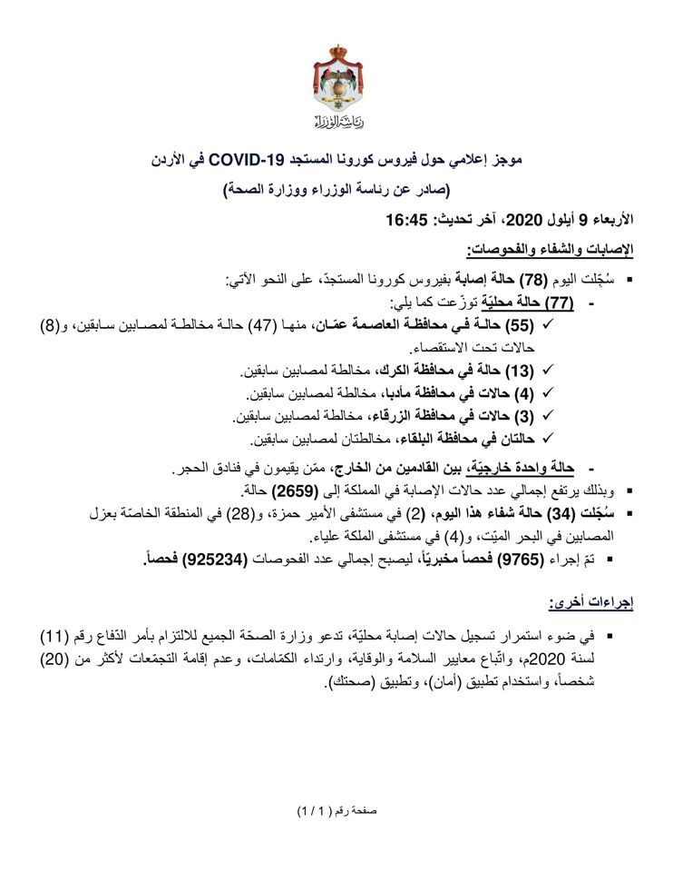 – سُجِّلت اليوم (78) حالة إصابة بفيروس كورونا المستجدّ، على النحو الآتي: