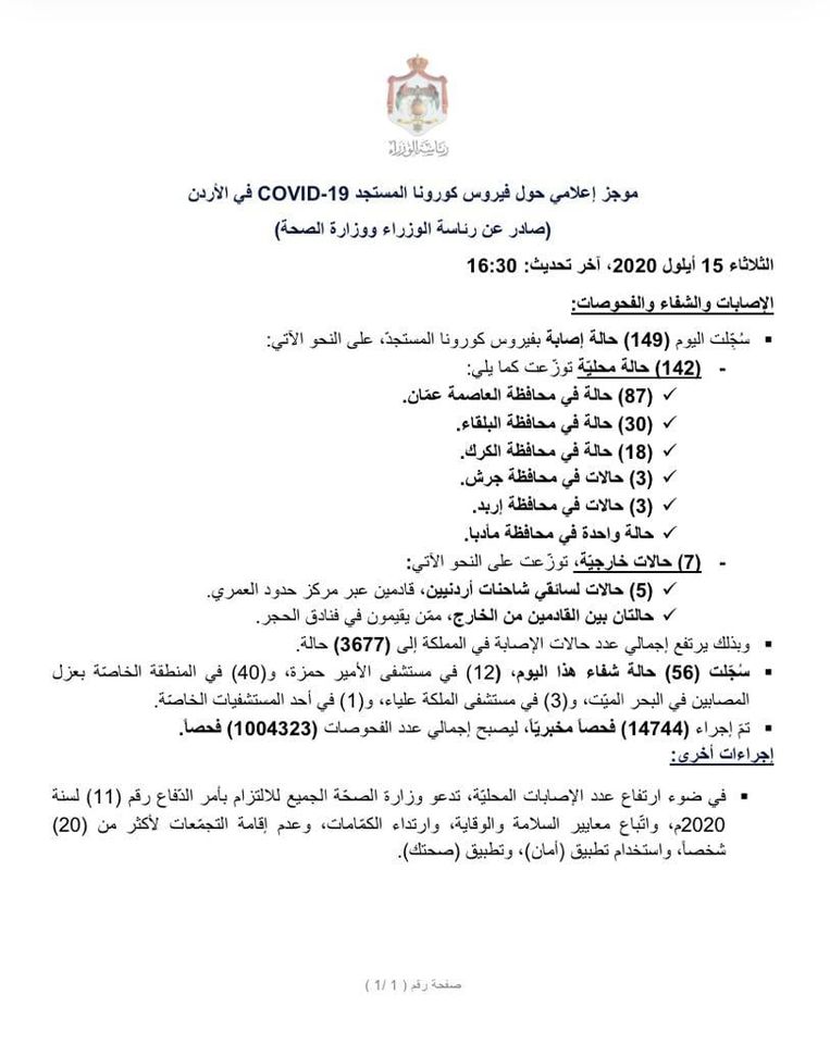 – سُجّلت (56) حالة شفاء هذا اليوم، (12) في مستشفى الأمير حمزة، و(40) في المنطقة الخاصّة بعزل المصابين في البحر الميّت، و(3) في مستشفى الملكة علياء، و(1) في أحد المستشفيات الخاصّة.