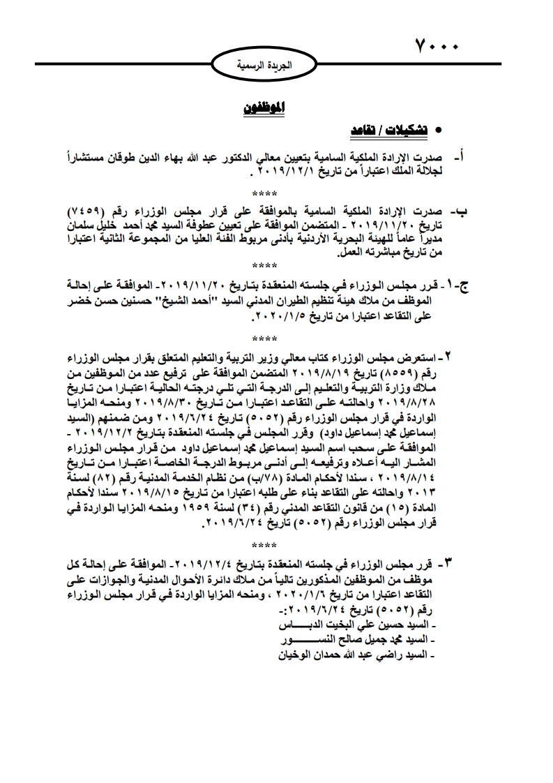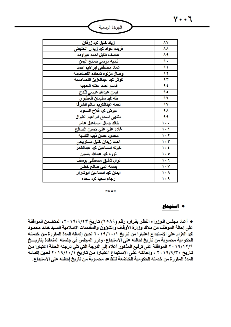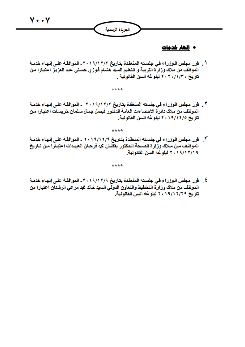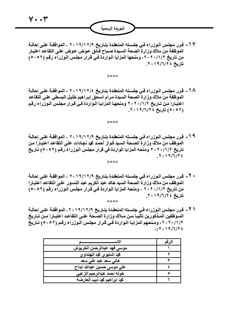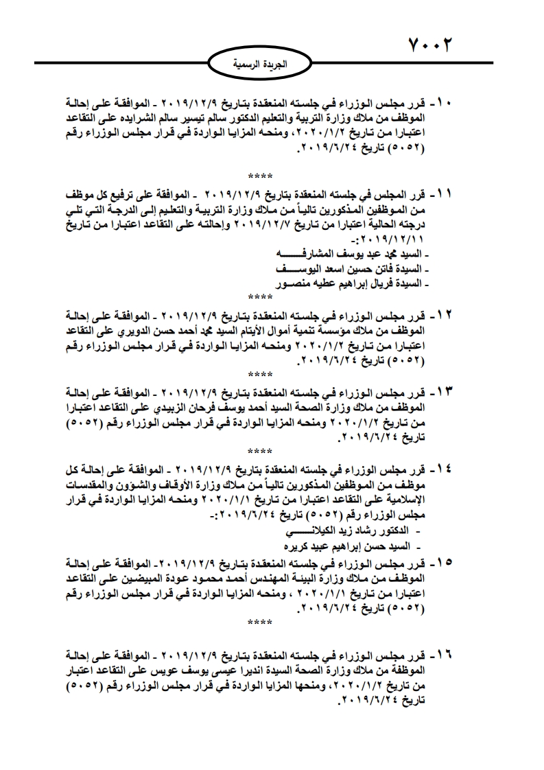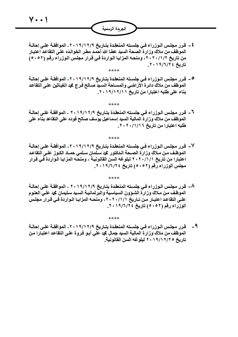 وكالة الناس – صدر في عدد الجريدة الرسمية اليوم الأربعاء قرارات مجلس الوزراء بإحالة عدد من موظفي الدولة إلى التقاعد، وتالياً الاسماء: