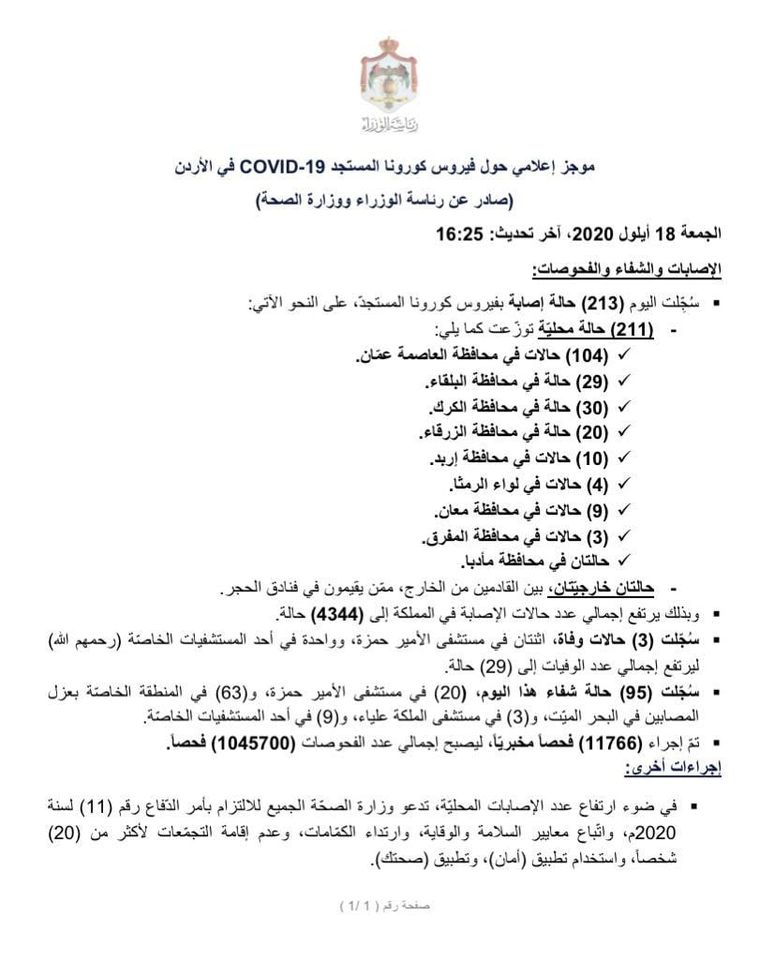 وكالة الناس – موجز إعلامي حول فيروس كورونا المستجد COVID-19 في الأردن (صادر عن رئاسة الوزراء ووزارة الصحة) الجمعة 18 أيلول 2020.