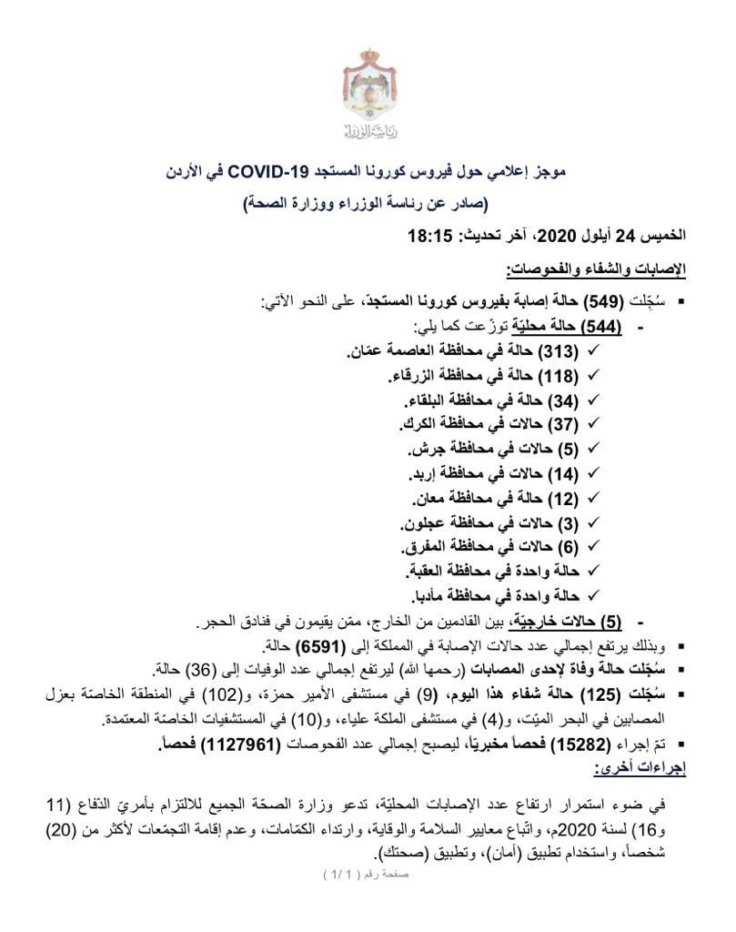 – سُجّلت (125) حالة شفاء هذا اليوم، (9) في مستشفى الأمير حمزة، و(102) في المنطقة الخاصّة بعزل المصابين في البحر الميّت، و(4) في مستشفى الملكة علياء، و(10) في المستشفيات الخاصّة المعتمدة.