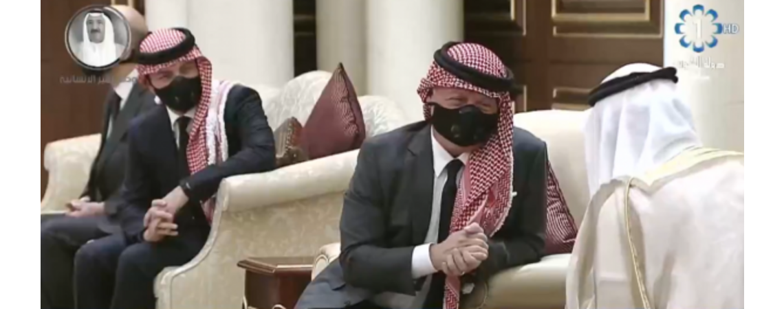 وكالة الناس – قدم جلالة الملك عبدالله الثاني، وسمو الأمير الحسين بن عبدالله الثاني ولي العهد، في الكويت اليوم، العزاء إلى سمو الشيخ نواف الأحمد الجابر الصباح، أمير دولة الكويت الشقيقة، بوفاة المغفور له، بإذن الله، سمو الشيخ صباح الأحمد الجابر الصباح.