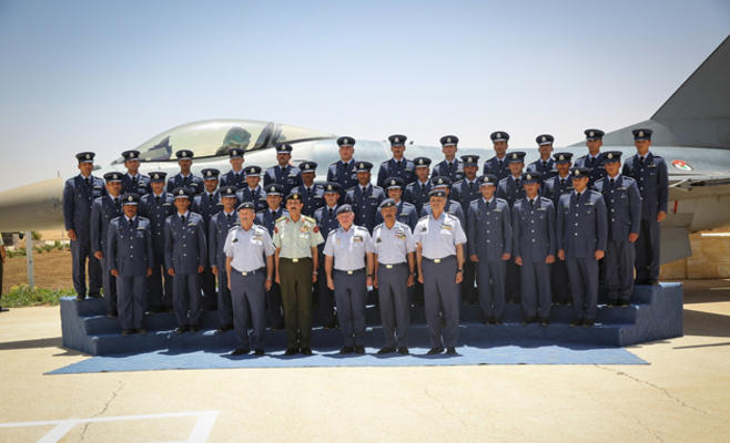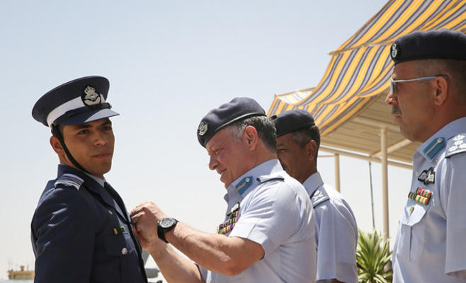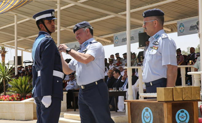 رعى جلالة الملك عبدالله الثاني القائد الأعلى للقوات المسلحة بحضور رئيس الوزراء وزير الدفاع الدكتور عبدالله النسور ورئيس هيئة الأركان المشتركة الفريق أول الركن مشعل محمد الزبن صباح اليوم الاثنين حفل تخريج دورة مرشحي الطيران الثالثة والأربعين في كلية الملك الحسين الجوية.